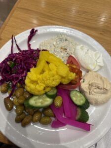 This will be a shorter update as Pastor Erik and Rich have only just arrived in the Middle East. They flew out of the states on Thursday at 11 pm Eastern time and arrived in Tel Aviv on Friday at 5 pm local time. Tired, but excited, they rode a bus to Beit Jala, a town connected with Bethlehem and stayed at a hotel there. The pictures include one that Pastor took of the Mediterranean Sea as they approached Tel Aviv. The other is the first plate of food Pastor Erik got once they go to their hotel.
