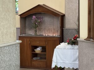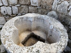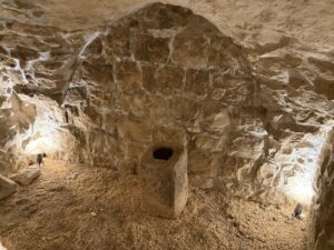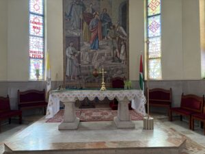 Pastor Erik and Rich visited a Catholic church in Taybeh today. This community is one of the last all Christian communities in Palestine. It has three active congregations which share in ministry together by doing joint youth ministry, providing jobs for people to work in farming and tourism, and provide pastoral support during times of danger. Taybeh holds the tradition of being the location of Ephraim where Jesus went to hide from people who wanted to kill him (see John 11:54~). The tradition holds that upon coming he received a pomegranate, which has become a Eucharistic symbol for the town. The church also had a little cave house that is similiar to what people may have lived in during Jesus’s time.